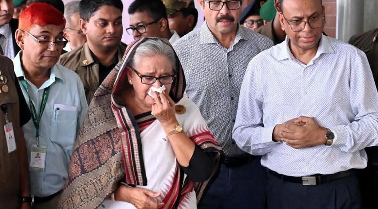 The pictures were taken during Ms Hasina's visit to a metro rail station in the city of Mirpur on Thursday, where ticket vending machines and the signalling control station were shattered. Ms Hasina was pictured frowning and wiping her tears with tissue paper.