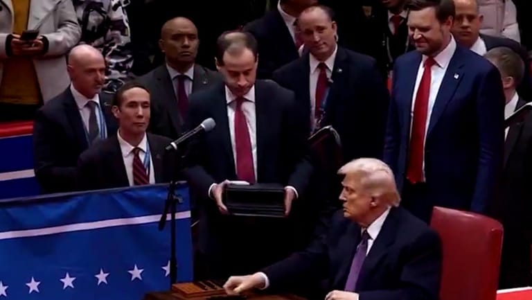 The U.S. President Donald Trump threw the pens he used to sign his first orders after taking the oath of office at the Capitol building to the crowd.
