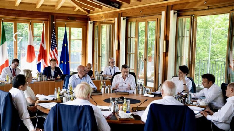 وستلتزم أكبر الاقتصادات أيضا برفع الرسوم الجمركية على الواردات الروسية إلى بلدانها، مع إعلان الولايات المتحدة عن رسوم جديدة على 570 فئة من السلع، فضلا عن استخدام العقوبات لاستهداف سلاسل التوريد الدفاعية الروسية.