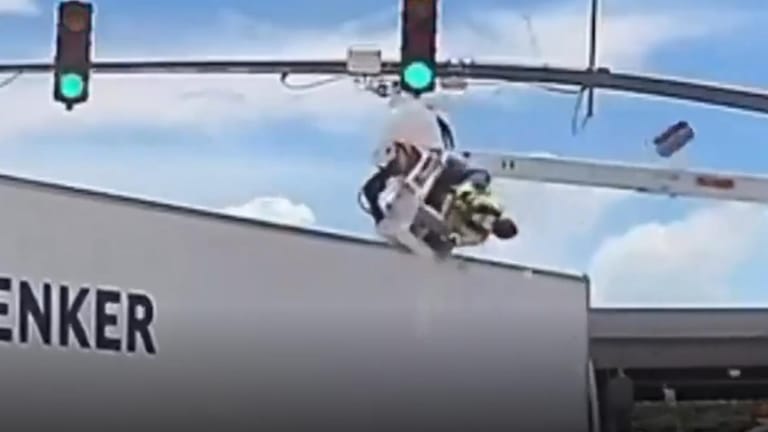 ويُظهر الفيديو المرفق، الشاحنة وهي تنعطف على تقاطع مروري، لتصطدم بزوايا الرافعة المرتفعة، ما أدى إلى انهيارها فجأة، وترك العامل معلقًا في الهواء لثوانٍ مثيرة للرّعب.