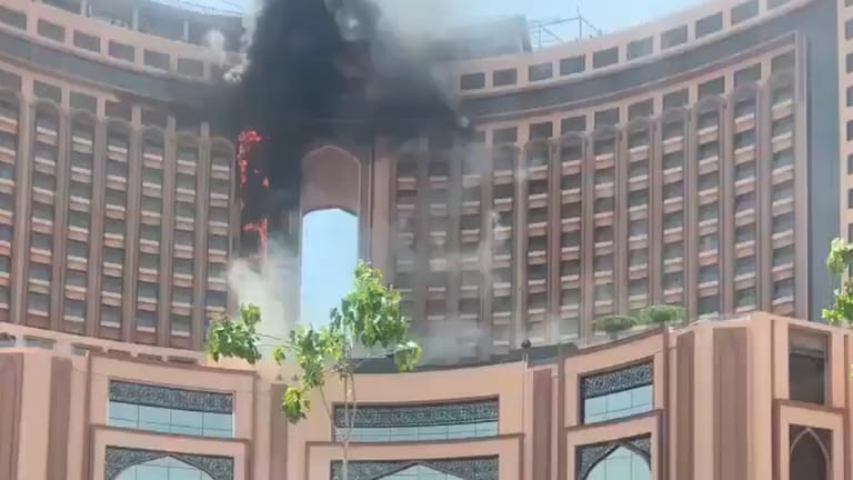 وجرى تداول مقاطع فيديو توثق تصاعد ألسنة اللهب من مبنى الفندق.