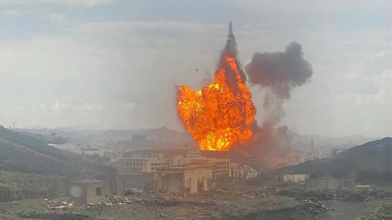 انفجار هائل لحظة استهداف أحد المواقع في العاصمة اليمنية صنعاء، في الفيديو المرفق.
