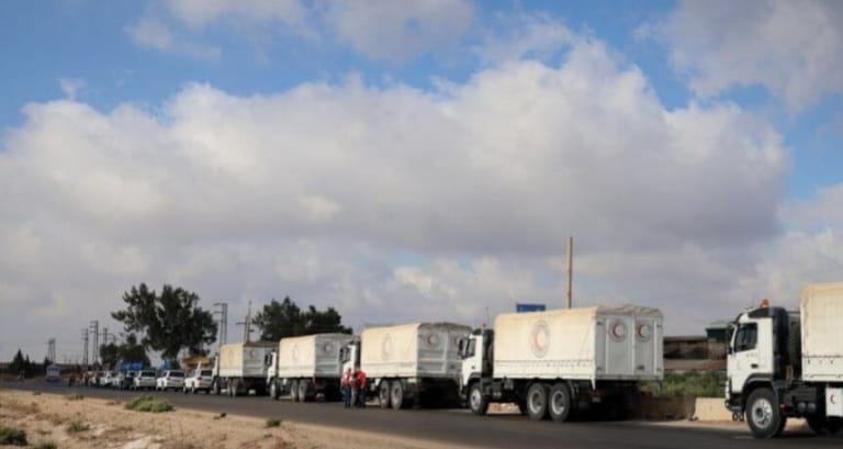 "سانا": وصول قافلة مساعدات تضم 31 شاحنة مواد غذائية وصحية وطبية إلى جسر مدينة إزرع في ريف درعا متوجهة إلى محافظة السويداء
