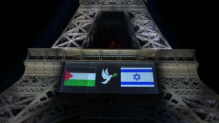 أضاء برج إيفل في باريس، مساء الأحد، أنواره باللون الأبيض، فيما عرضت شاشة مثبتة عليه علمَي فلسطين وإسرائيل، تفصل بينهما حمامة ترمز للسلام، على النصب التذكاري.