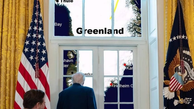 نشر البيت الأبيض صورة للرئيس الأميركي دونالد ترامب يقف أمام نافذة تظهر خلفها خريطة غرينلاند، مصحوبة بتعليق غامض "نراقب الموقف"، وذلك عقب تصاعد تصريحاته المتكررة حول ضرورة ضم الجزيرة الدنماركية لأسباب استراتيجية واقتصادية. كما نصّب نفسه حاكماً موقّتاً لفنزويلا، ودعم تنصيبه هذا بصورة له من موقع "ويكيبيديا" حملت عنوان "رئيس فنزويلا بالوكالة"، في موقف غير مُستغرب له بعد سلسلة تصاريح سابقة أعلن فيها صراحة أنّ عينه على العديد من البلدان الأخرى خصوصاً في أميركا اللاتينيّة.