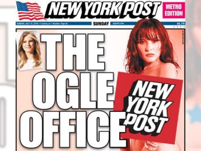 The picture showed a nude Melania being hugged by another nude woman as she lay in bed. On Sunday, the Post ran a front-page picture of a nude Melania, with stars covering her breasts, under the title "The Ogle Office".
