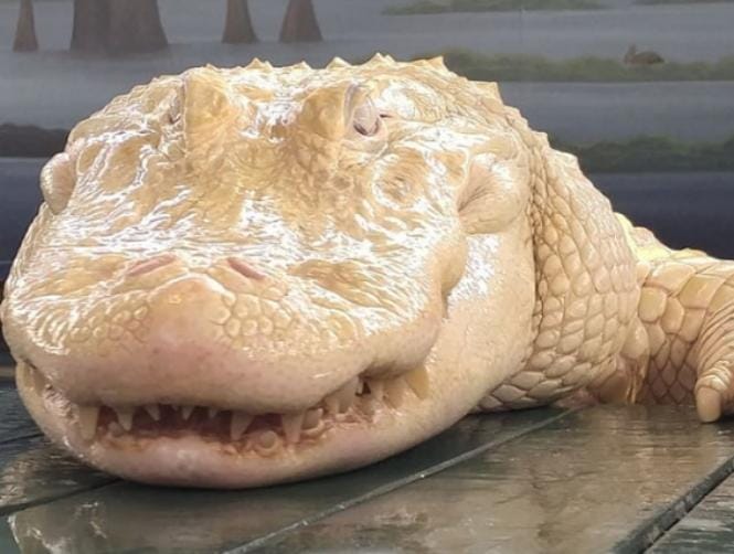 An unusual albino alligator with completely white skin has become the star attraction at a US theme park in Florida.