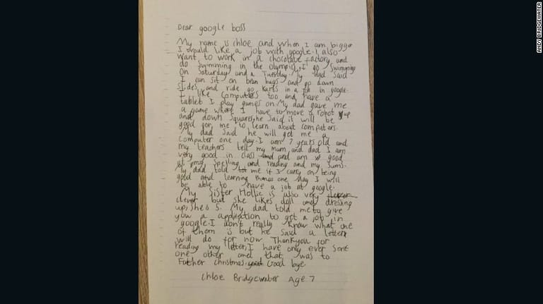 Andy Bridgewater, Chloe's father, posted the response to LinkedIn, thanking Pichai for taking the time out to write to his daughter.