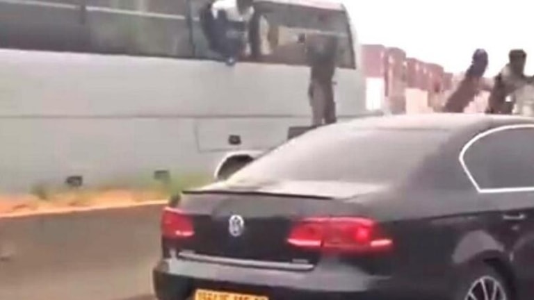 ويُظهر الفيديو عدداً من المهاجرين وهم يقفزون تباعاً من نافذة الحافلة في منتصف طريق، قبل أن يتسلّلوا بين السيارات ويتواروا عن الأنظار.