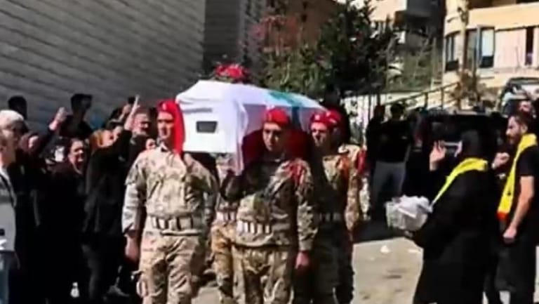 بعد ذلك، رفعت الجثامين على أكف عناصر من الجيش اللبناني، ولفت بالعلم اللبناني، ووسط نثر الورود والزغاريد، أدت ثلة من العسكريين التحية العسكرية للشهداء الثلاثة، فيما سار أمام النعوش حملة الاكاليل والاوسمة.