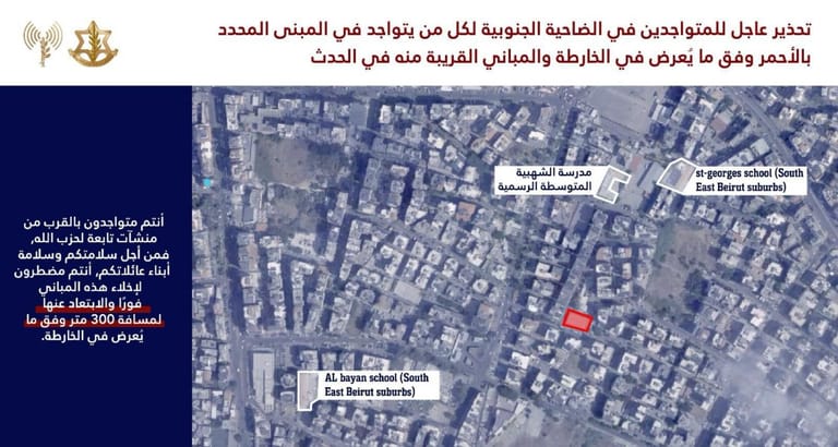 وكتب أدرعي على "إكس": "لكل من يتواجد في المبنى المحدد بالأحمر وفق ما يُعرض في الخارطة المرفقة والمباني المجاورة له: أنتم تتواجدون بالقرب من منشآت تابعة لحزب الله. من أجل سلامتكم وسلامة أبناء عائلاتكم أنتم مضطرون لإخلاء هذه المباني فوراً والابتعاد عنها لمسافة لا تقل عن 300 متر وفق ما يُعرض في الخارطة".