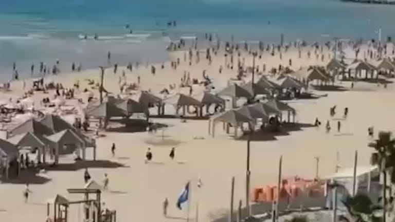 هروب روّاد الشاطئ في تل أبيب بالتزامن مع إطلاق صاروخ من اليمن باتجاه إسرائيل.