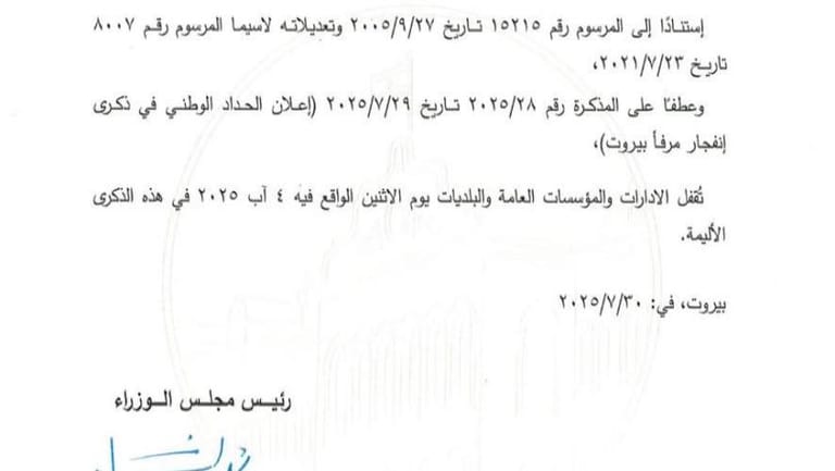 أصدر مجلس الوزراء المذكرة رقم 29/2025 والتي تقضي بإقفال الإدارات والمؤسسات العامة والبلديات في ذكرى انفجار مرفأ بيروت.