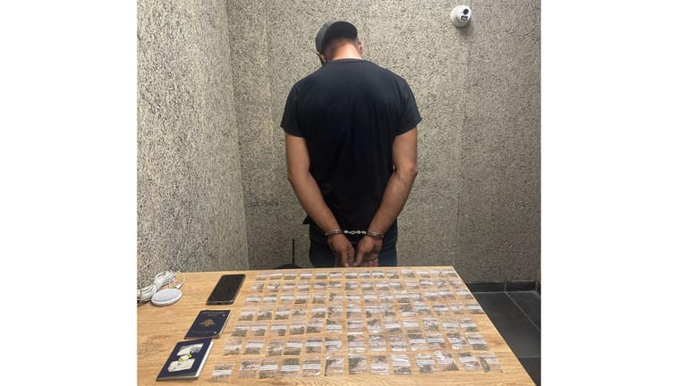 بتفتيشه، ضُبط بحوزته /95/ كيس نايلون شفّاف يحتوي على مادّة السَّلفيا، معدّة للتّرويج.