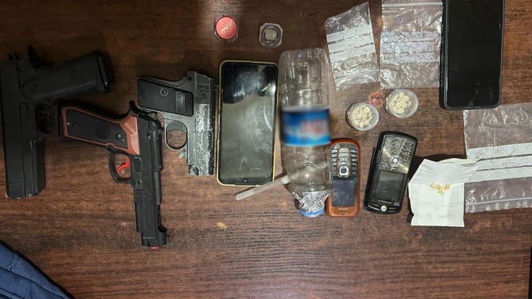 وبتفتيشهما، تم ضبط / ٤ / هواتف خلوية، مسدسان بلاستيكيان ومسدس معدني صغير الحجم، تُستخدم في عمليات النشل والسلب وكمية من المواد المخدّرة موزّعة على الشكل التالي: