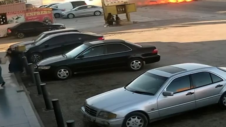 لحظة قصف سيارة على طريق المصنع، في الفيديو المرفق.