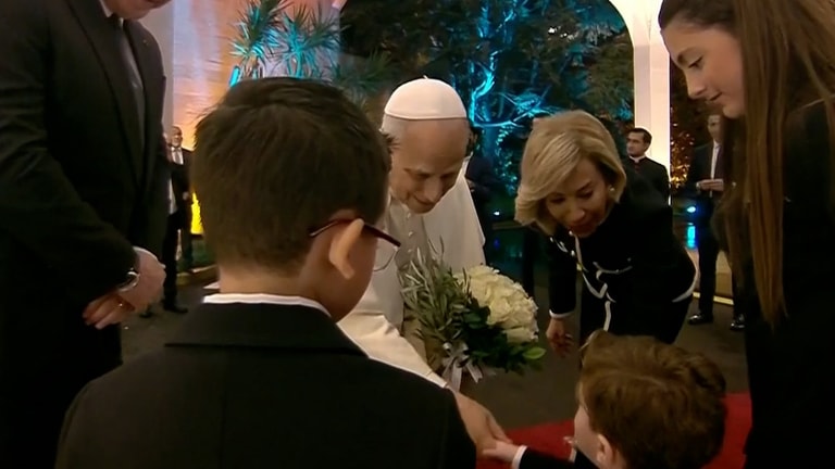 استقبل أحفاد رئيس الجمهورية جوزاف عون بالبابا لاوون الرابع عشر عند مدخل القصر الجمهوري، وقدّموا له باقة ورود وقصفة زيتون.