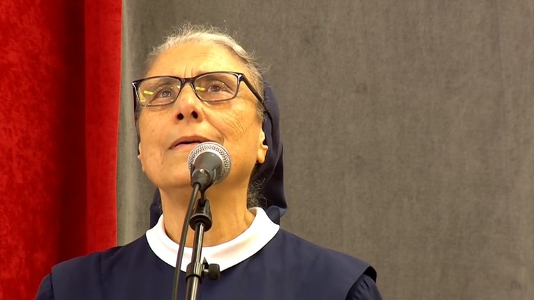 الرئيسة العامة لجمعيّة راهبات الصليب الأمّ ماري مخلوف تبكي تأثّراً خلال إلقاء كلمة في حضور البابا لاوون الرابع عشر، وهو تظهر عليه علامات التأثّر.