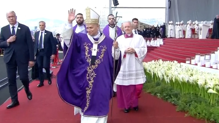 سلام البابا لاوون الرابع عشر للمؤمنين بعد انتهاء القداس الإلهي في واجهة بيروت البحرية على وقع الهتافات ورفع أعلام لبنان والفاتيكان.