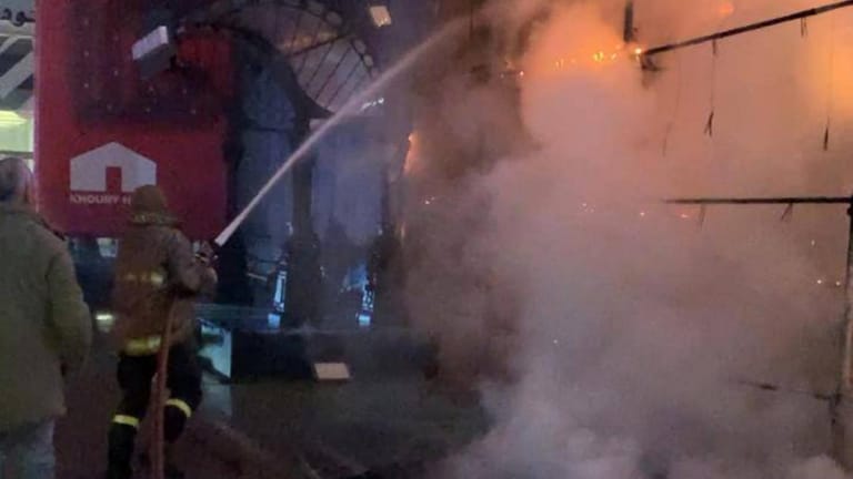 أخمد عناصر الدفاع المدني النيران التي اندلعت في الواجهة الأمامية التي وضعت أمام محال "خوري هوم" في منطقة الدورة، كزينة للأعياد.