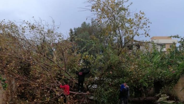 The strong winds uprooted a number of trees, thus blocking Nabaa Street to traffic. The storm has also caused material damage to properties.
