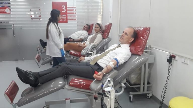 زار السفير الهولندي في لبنان يان والتمانس مع وفد مرافق من السفارة المقر الرئيس للصليب الأحمر اللبناني في سبيرز (بيروت) وبادروا إلى التبرع بالدم في المركز.