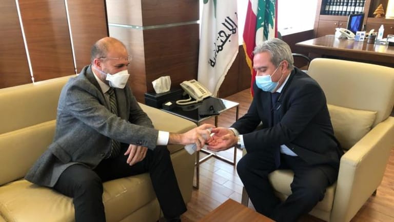 إفتتح وزيرا الشؤون الإجتماعية والسياحة البروفسور رمزي المشرفية والصحّة العامّة الدكتور حمد حسن اجتماعهما صباح اليوم في وزارة الشؤون بتعقيم متبادل لليدين كتدبير وقائي ضمن التدابير التي سبق أن أعلنت عنها وزارة الصّحة للحماية من الوباء العالمي "كورونا".