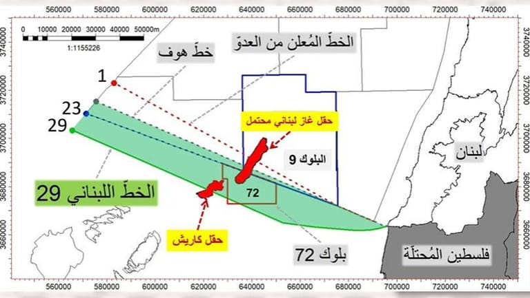 تتحدّث معلومات عن وجود حقل غاز لبناني محتمل (المحدّد باللون الاحمر في الصورة المرفقة) في البلوك رقم 9 يمتد الى ما بعد الخط٢٣ والى البلوك٧٢ الذي ينوي العدو الاسرائيلي السطو عليه، وهو أكبر من حقل كاريش.