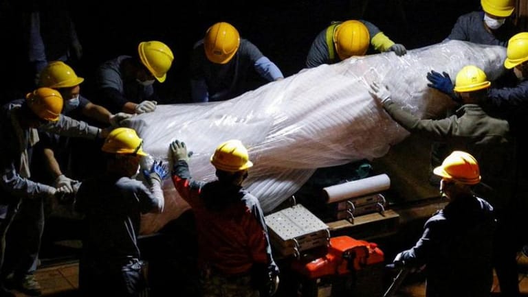 Loud noises from power tools and chains rose from a closed off area for hours on Wednesday night before workmen were seen carrying out separate parts of the statue and winching them up on a crane towards a waiting shipping container. HKU said on Thursday it had put them in storage.