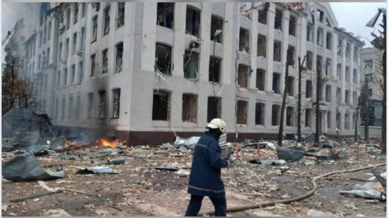 تعرّض مبنى جهاز الأمن الأوكراني في خاركيف للقصف الروسي، ما أدى إلى دمار هائل فيه.