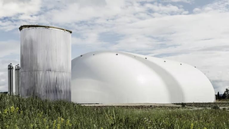 Energy Dome's batteries use huge domes with giant, flexible bladders full of carbon dioxide gas in them. It "charges" its battery by using energy to run electric compressors that squeeze the gas into smaller and smaller volumes, eventually condensing it into a liquid, which is stored under pressure at ambient temperatures. This charging process creates waste heat, which is captured in a thermal energy storage system.