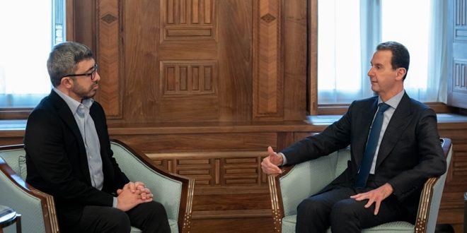 President Bashar al-Assad received on Sunday Foreign and International Cooperation Minister of the UAE, Sheikh Abdallah bin Zayed Al Nahyan, and the accompanying delegation to discuss the repercussions and effects of earthquake that hit Syria.