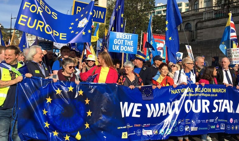 Protesters brandished placards reading "the road to rejoin the EU starts here", and "rejoin, rejoice".