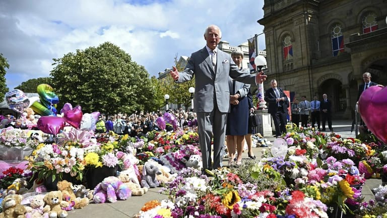 King Charles III met Tuesday with survivors of the stabbing rampage that killed three young girls in northern England, viewing flowers and teddy bears laid in remembrance of the victims and signing a book of condolence as Britain recovers from widespread unrest fueled by misinformation around the tragedy.