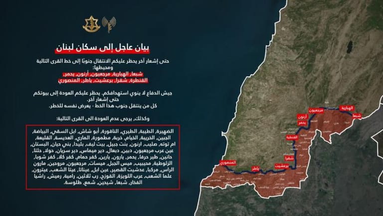 وقال المتحدث باسم الجيش الإسرائيلي أفيخاي أدرعي على منصة "أكس": "بيان عاجل إلى سكان لبنان: أذكركم انه حتى إشعار آخر يحظر عليكم الانتقال جنوبًا إلى خط القرى الآتية ومحيطها: شبعا، الهبارية، مرجعيون، أرنون، يحمر، القنطرة، شقرا، برعشيت، ياطر، المنصوري. الجيش الإسرائيلي لا ينوي استهدافكم ولذلك يحظر عليكم في هذه المرحلة العودة إلى بيوتكم من هذا الخط جنوبًا حتى إشعار آخر. كل من ينتقل جنوب هذا الخط - يعرض نفسه للخط".