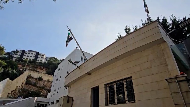 رفع علم الثورة السورية على مبنى السفارة السورية في بيروت.