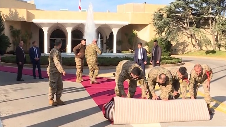 Preparations are in full swing at the presidential palace in Baabda to welcome the incoming president, with the Lebanese flag being raised and the red carpet being laid out in front of the palace entrance.