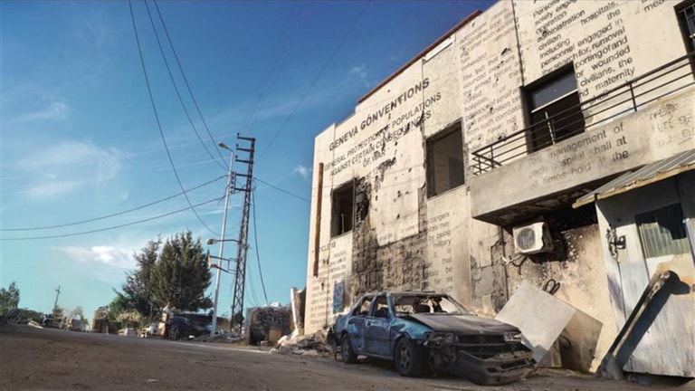 وسط أنقاض المستشفىً، قام رسام الجداريات والخطاط اللبناني غالب حويلا، بدقة، بنقش مواد من اتفاقية جنيف على جدران المبنى المُحطمة للمستشفى. كلّ شقّ وحرق يقف كتذكيرٌ صارخ بضرورة احترام القانون الدولي الإنساني وعدم تجاهله.