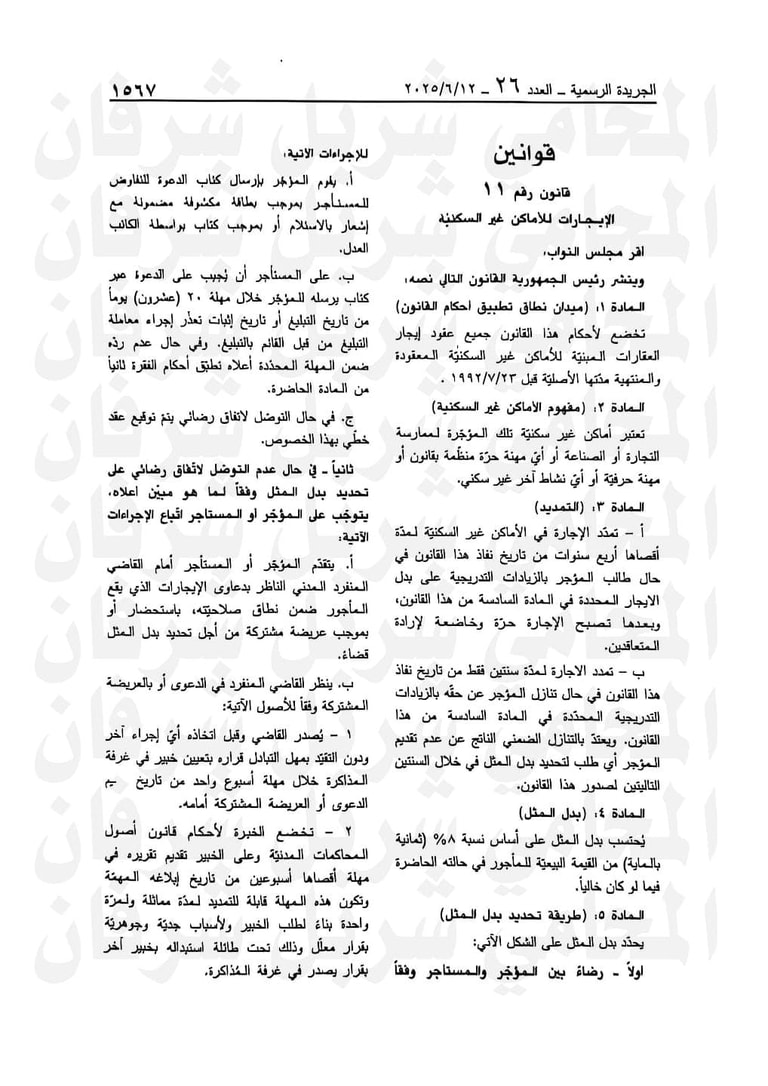 تمّ نشر قانون الإيجارات للأماكن غير السكنية في الجريدة الرسمية ودخل حيّز التنفيذ، وذلك بعد إصداره من قبل رئيس الجمهورية جوزاف عون وتحويله إلى النشر من قبل رئيس الحكومة نواف سلام.