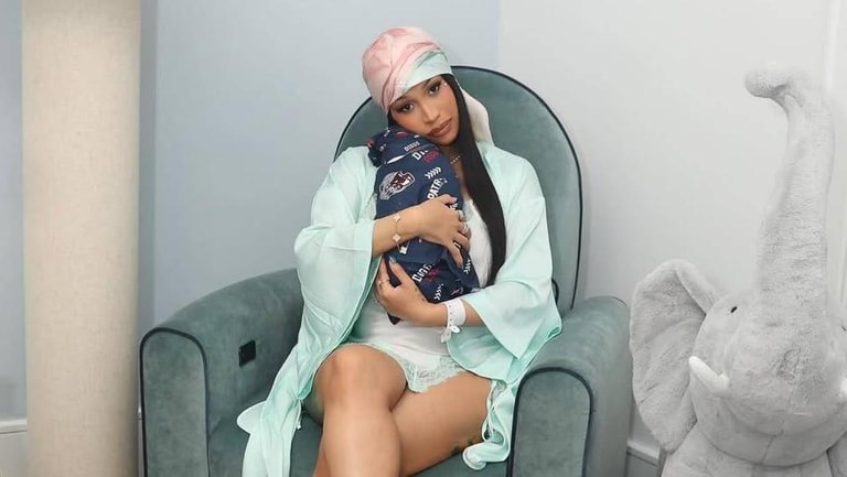 وأطلّت مغنّية الراب في منشور عبر حسابها في "إنستغرام"، حاملةً طفلها الرضيع، مرتديةً لانجري من الساتان باللون الأخضر النعناعي، في لحظات مؤثرة بين الأم وطفلها، والذي احتضنته للمرة الأولى بعد الولادة على سرير المستشفى.