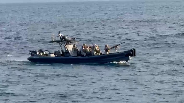 Lebanese Army naval patrols near the Beirut waterfront ahead of the Divine Liturgy to be celebrated by Pope Leo XIV.