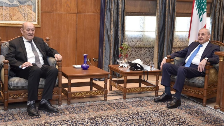 Parliament Speaker Nabih Berri welcomed French presidential envoy Jean-Yves Le Drian and his accompanying delegation at the Second Presidency in Ain al-Tineh, in the presence of French Ambassador Hervé Magro.