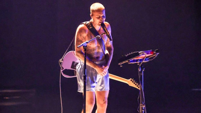 بيبر، الذي عُرف بأناقته اللافتة على السجادة الحمراء حيث ظهر ببدلة رسمية واسعة، فاجأ الجميع على المسرح بإطلالة جريئة وبسيطة في آنٍ واحد، إذ اكتفى بارتداء سروال داخلي حريري وجوارب طويلة، منسجمًا مع الأجواء الحميمة للأداء. وخلال العرض، عزف على غيتاره الكهربائي وقام بتسجيل المقاطع الموسيقية وتكرارها مباشرة أمام الجمهور، في مشهد عكس تركيزه الكامل على الموسيقى والتجربة الفنية الخالصة.