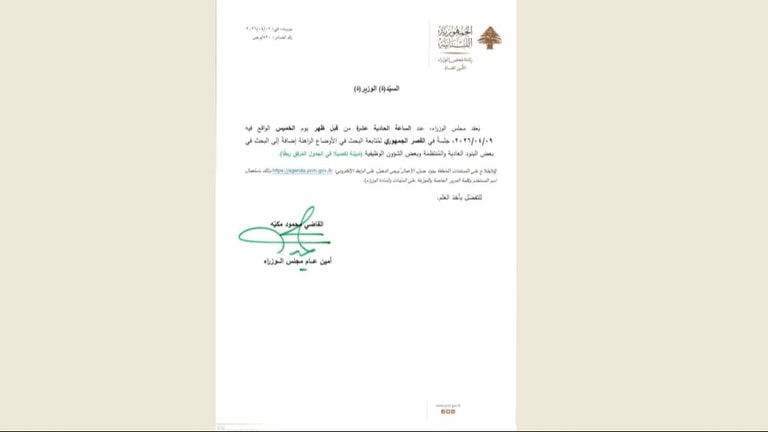The Council of Ministers will hold a session at the Presidential Palace in Baabda on Thursday, April 9, at 11:00 am, to continue discussions on the current situation, in addition to discussing some regular items as well as administrative matters.
