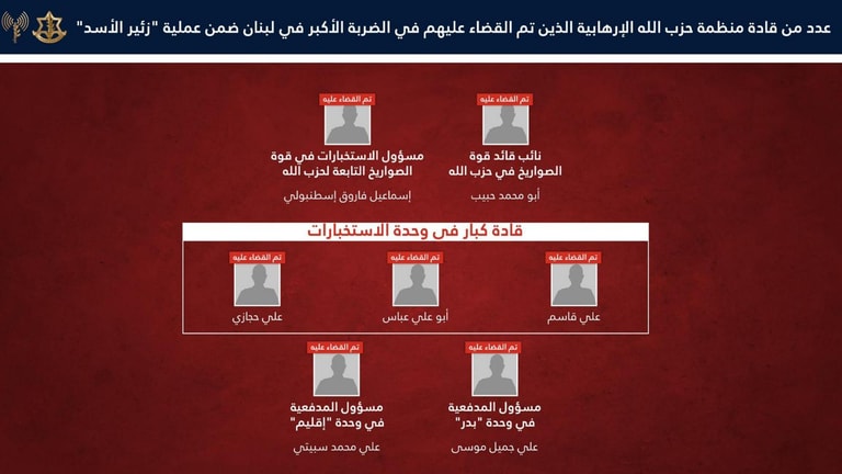 وأضاف: القادة الذين تمت تصفيتهم في الضربة كانوا مسؤولين عن تشغيل مجمل منظومات منظمة حزب الله، مع التركيز على قدرات النيران، الاستخبارات والدفاع، ومن بينهم: