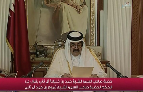 In a speech broadcast on Qatar television, Qatar's Sheikh Hamad bin Khalifa al-Thani announced that he will transfer power to his son Sheikh Tamim.