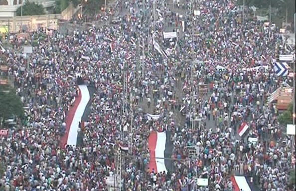 The anti-Morsi crowd swelled in the iconic square as people poured in from sidestreets, some unfurling a giant national flag emblazoned with the words "Go away" -- a slogan used widely on June 30.