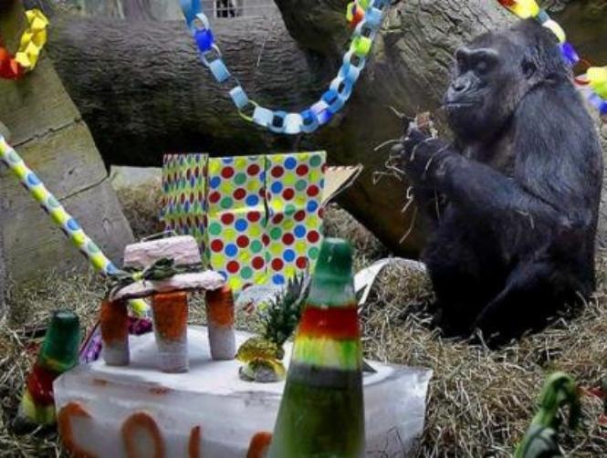 احتفلت أنثى غوريلا ملقبة بـ"فاتو" بعيد ميلادها الـ59 في حديقة الحيوان ببرلين حيث تلقت سلة مليئة بالفواكه اللذيذة والخضروات كهدية في هذه المناسبة.