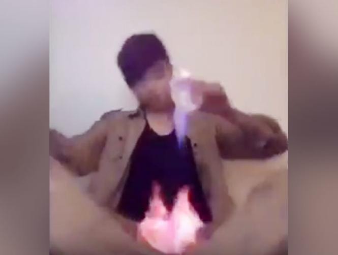 The footage begins with the young daredevil carelessly dipping his fingers into a glass of burning alcohol to transfer the flame to his cigarette.