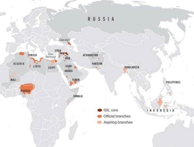 The map also shows "aspiring branches" in Mali, Egypt, Somalia, Bangladesh, Indonesia and the Philippines.
